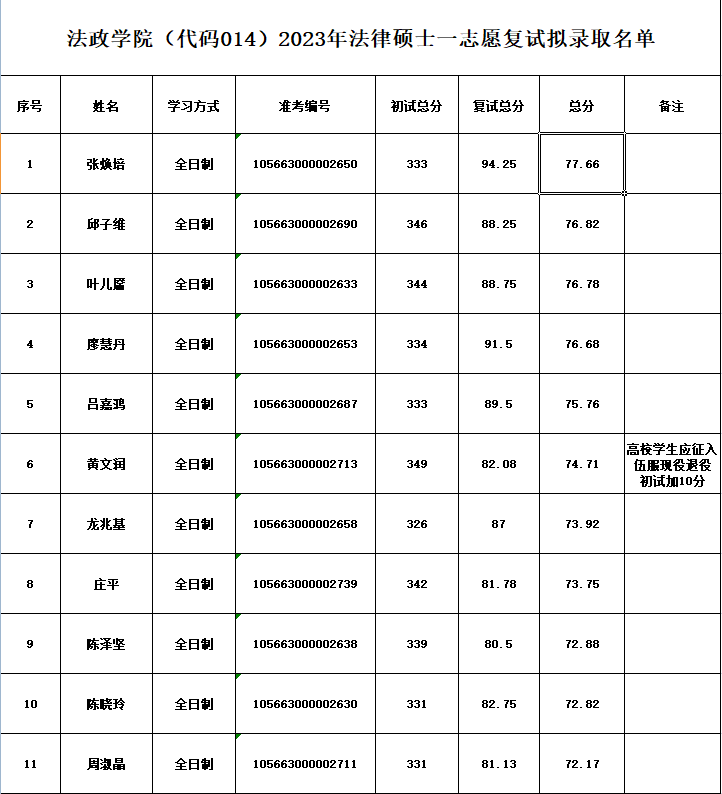 现将2023年硕士研究生招生法律专业拟录取考生名单公示如下。
