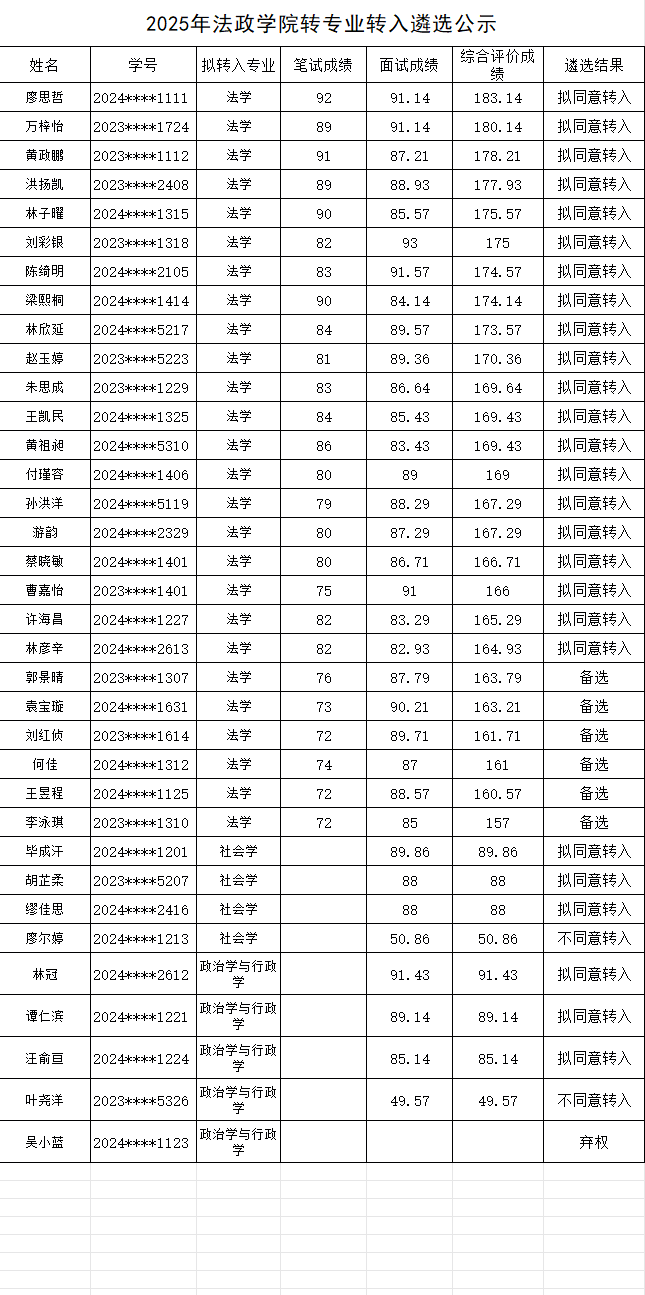 根据《2025年304永利集团有限公司全日制本科生转专业员工遴选办法》,公司组织了转专业转入遴选工作。经员工申报笔试、面试考核,公司转专业工作委员会根据综合成绩进行了排序和遴选,拟同意廖思哲等26名员工转入公司相关专业。现对相关情况予以公示。