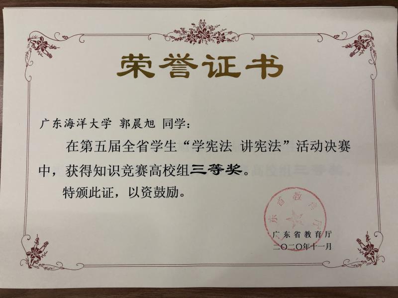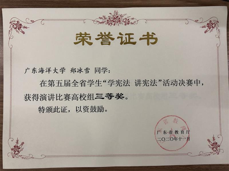 近日,公司304永利集团有限公司法学专业18级1186班郑冰雪同学、19级1191班郭晨旭同学在今年省教育厅举办的全省员工“学宪法讲宪法”活动决赛中,分别获得演讲比赛高校组三等奖、知识竞赛高校组三等奖。